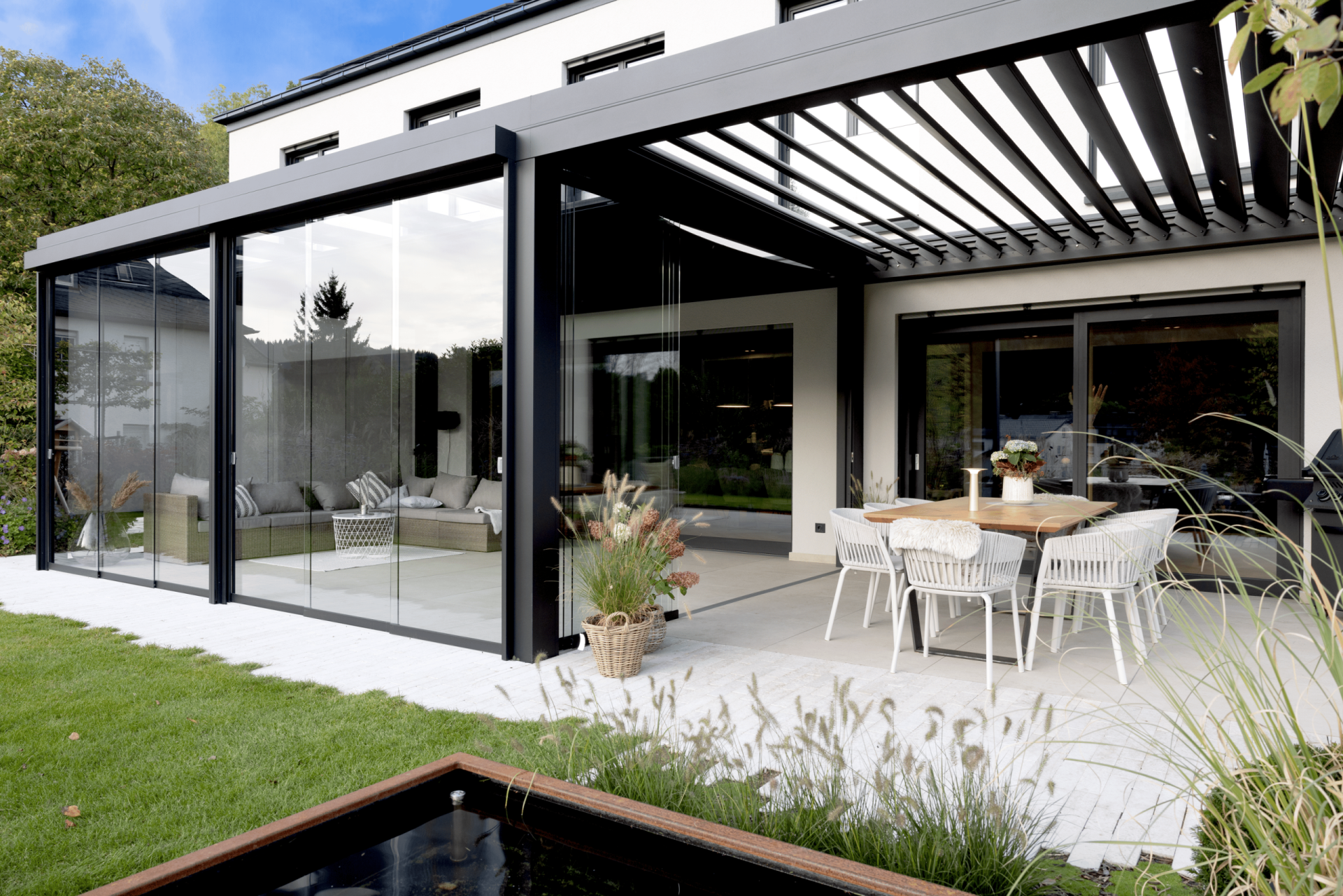 Maximale Flexibilität im Außenbereich. Lamellendächer ermöglichen die individuelle Steuerung von Sonne, Schatten und Belüftung und passen ideal zu moderner Architektur.